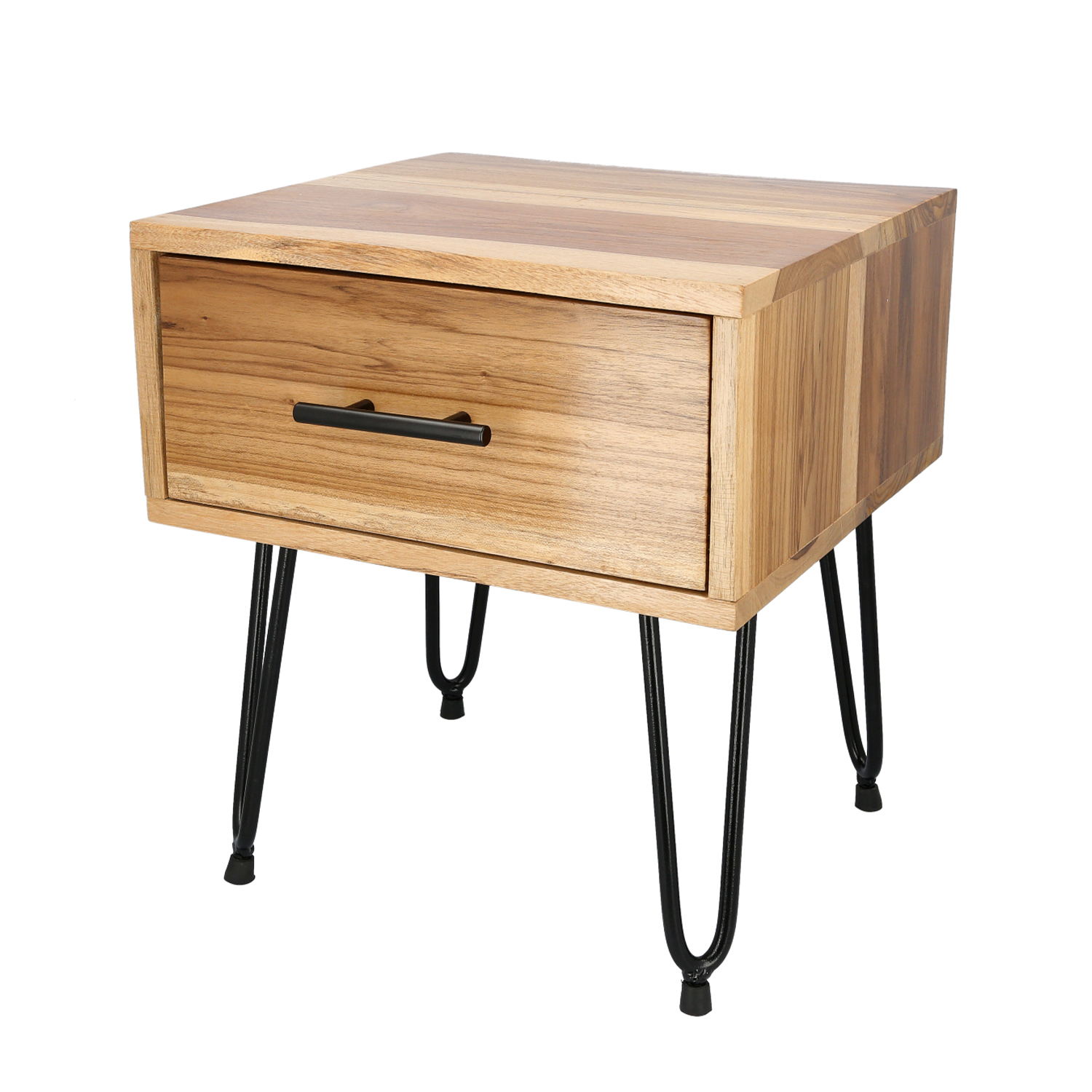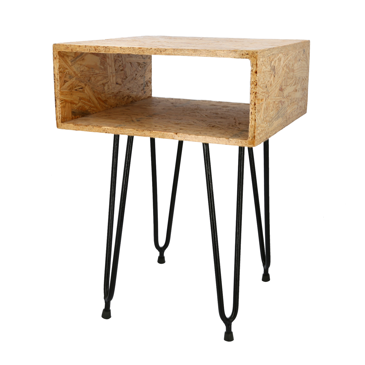 Un nochero sencillo fabricado con hierro y madera OSB comprimido.