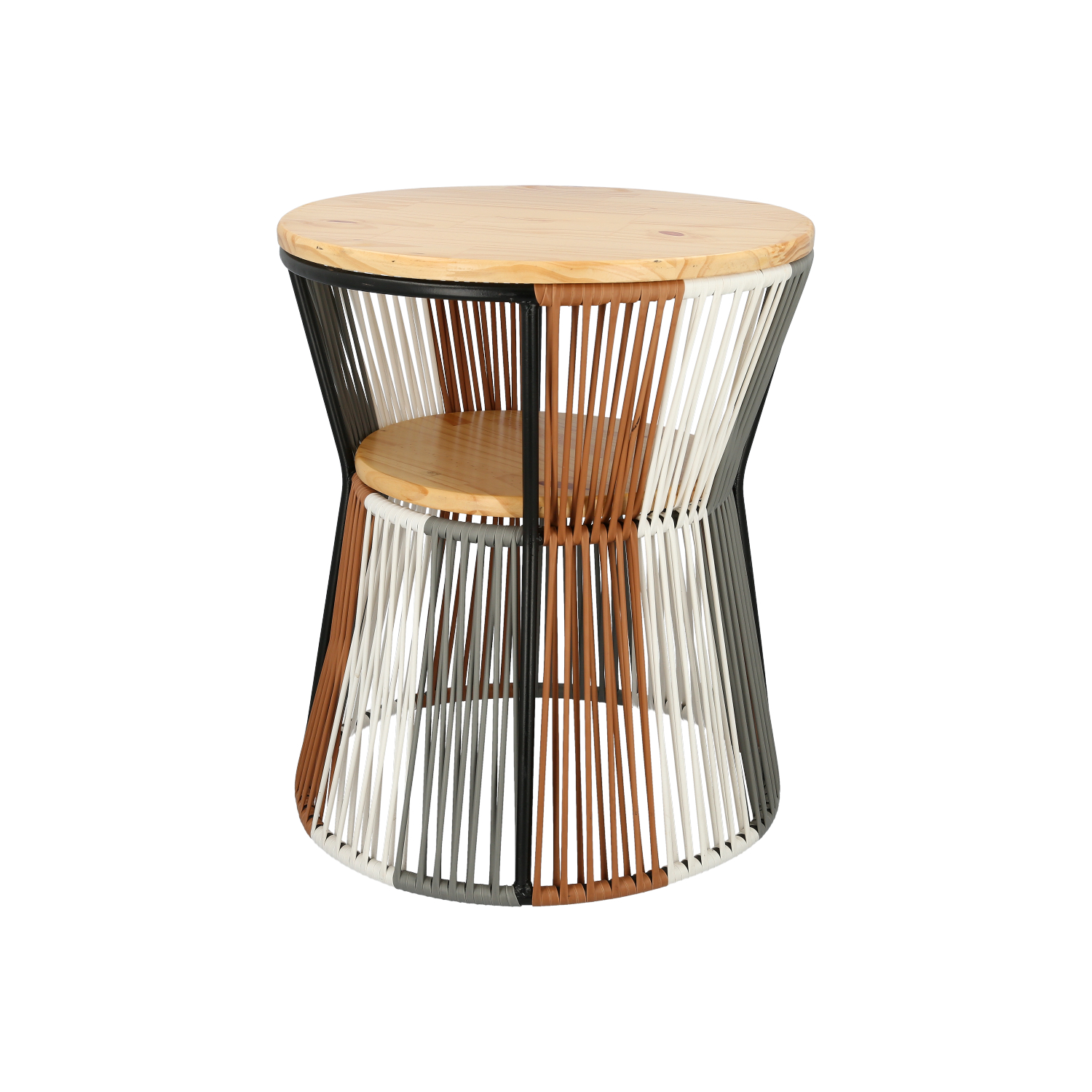 Mesa tambor fabricada con madera, hierro y mimbre sintético. Ideal para bridar elegancia cualquier espacio.