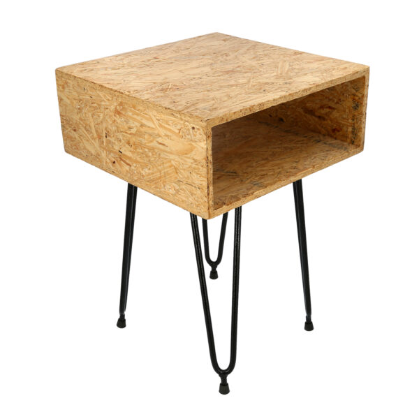 Un nochero sencillo fabricado con hierro y madera OSB comprimido.